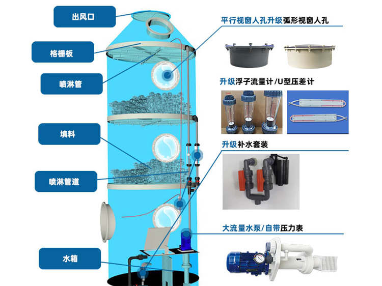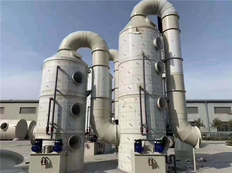 PP噴淋塔也叫做PP洗滌塔、酸霧凈化塔–酸堿廢氣處理設(shè)備;噴淋塔工作原理:噴淋塔主要的運(yùn)作方式是廢氣由風(fēng)管引入凈化塔,經(jīng)過(guò)填料層,廢氣與吸收液進(jìn)行氣液兩相充分接觸吸收中和反應(yīng),酸霧廢氣經(jīng)過(guò)凈化后,再經(jīng)除霧板脫水除霧后由風(fēng)機(jī)排入大氣。吸收液在塔底經(jīng)水泵增壓后在塔頂噴淋而下,之后回流至塔底循環(huán)使用。凈化后的酸霧廢氣達(dá)到地方排放標(biāo)準(zhǔn)的排放要求,低于國(guó)家排放標(biāo)準(zhǔn)。噴淋塔的結(jié)構(gòu)組成:酸堿廢氣塔分單塔體和雙塔體以及立式噴淋塔與臥式噴淋塔。用法蘭分段連接而成。具體由貯液箱、塔體、進(jìn)風(fēng)段、噴淋層、填料層、旋流除霧層、出風(fēng)錐帽、觀檢孔等組成。