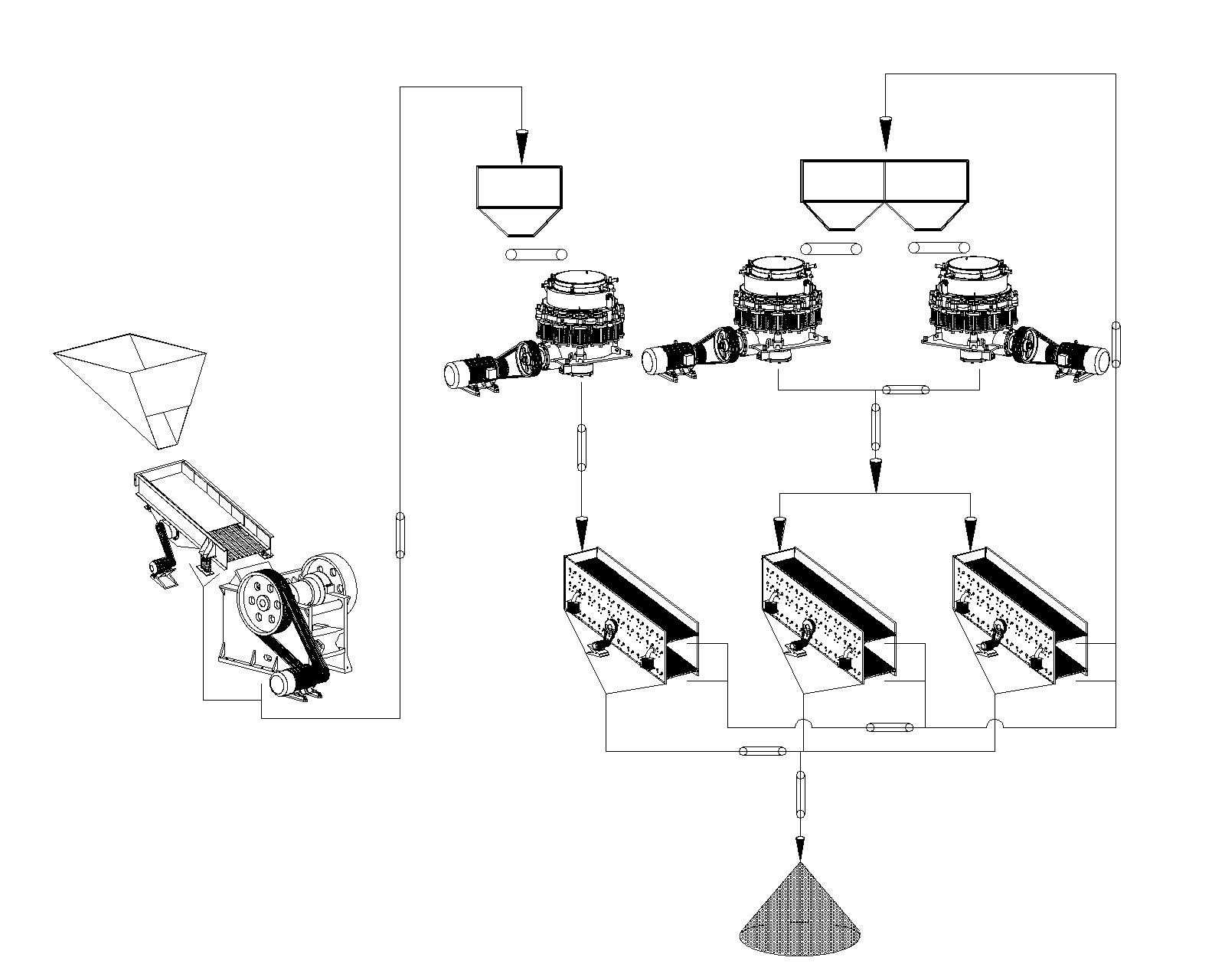 大塊的錳礦石經(jīng)料倉由振動給料機均勻地送進顎式破碎機或粗碎移動站進行粗碎;粗碎后的錳礦石經(jīng)過振動篩篩分后,由皮帶輸送機送到單缸液壓圓錐式破碎機進行中碎;中碎后的錳礦石物料送入多缸液壓圓錐式破碎機進行細碎;