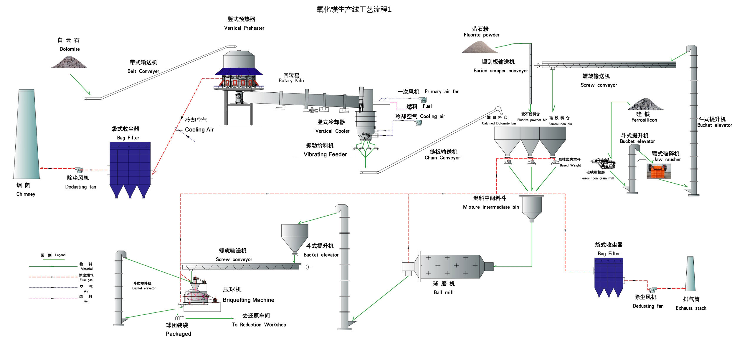 回轉(zhuǎn)窯生產(chǎn)鎂的原料是白云石,白云石先由破碎機(jī)破碎成30-40mm的物料,再由金屬鎂回轉(zhuǎn)窯燒結(jié),煅燒成煅白后再由冷卻機(jī)冷卻,冷卻后的再由球磨機(jī)研磨成粉,壓球機(jī)再把磨成的粉壓成球,經(jīng)破碎與含硅75%硅鐵粉,含GaF2為95%的螢石粉混合均勻制成團(tuán),把其裝入耐熱不銹鋼的還原罐中,在還原爐1200-1250℃及1.33Pa真空下,還原制取粗鎂,再經(jīng)熔劑精制、鑄錠、再經(jīng)表面處理得到成品鎂錠。